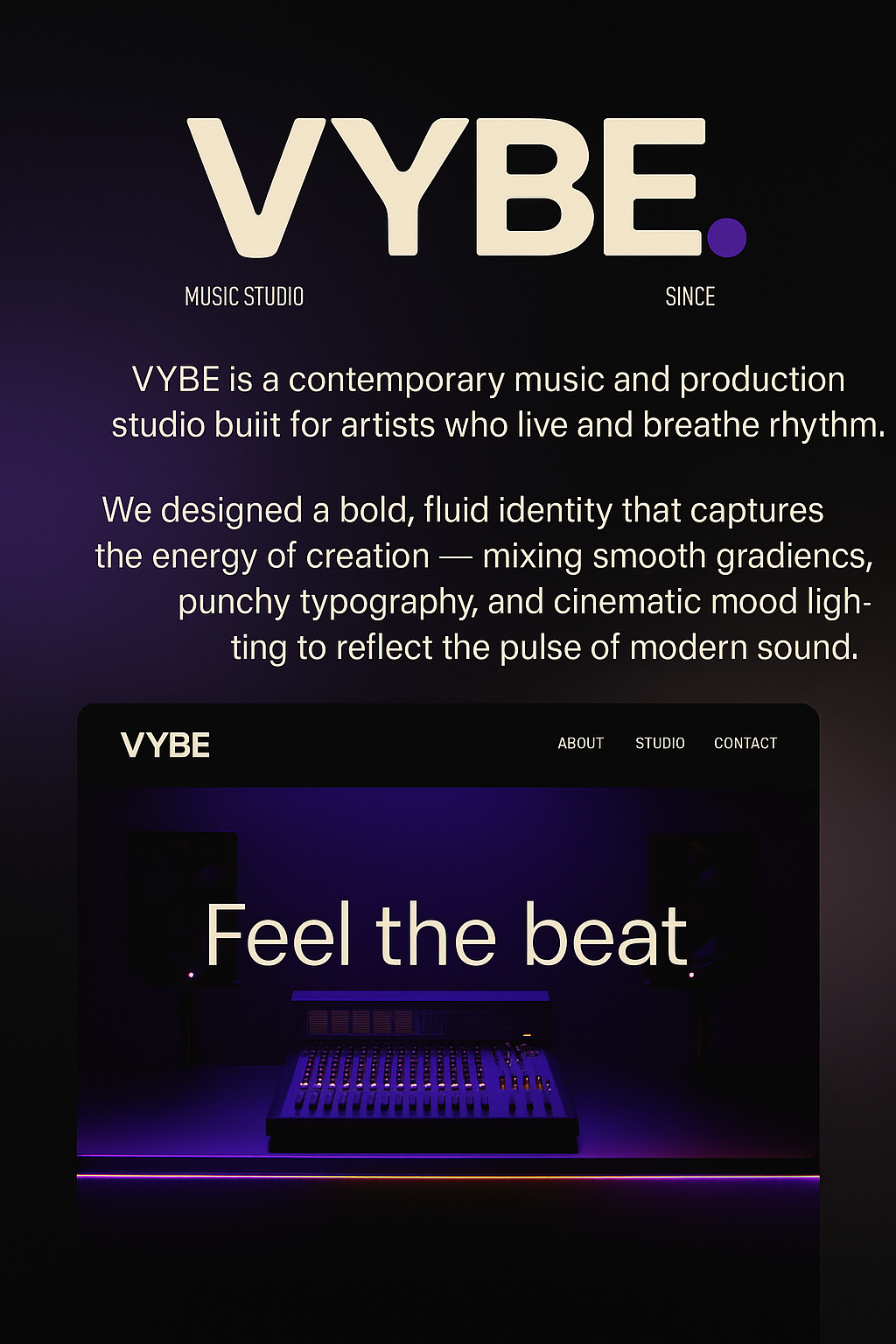 A contemporary music and production studio built for artists who live and breathe bold. We designed an authentic, fluid identity that captures the energy of creation — mixing smooth gradients, punchy typography, and cinematic mood lighting.